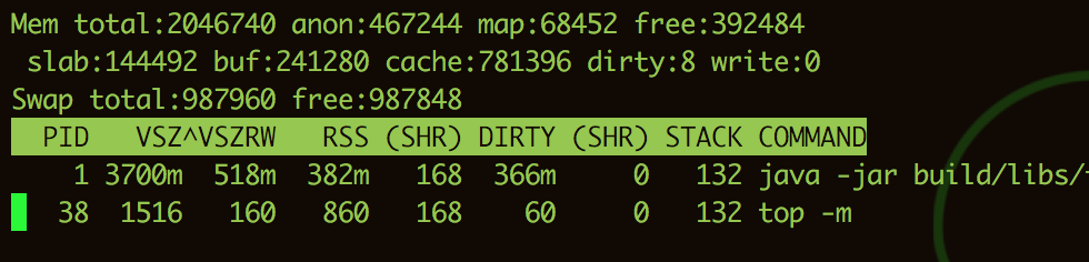 Aha! There's a Gradle process running which is reporting an RSS (Resident set size) just as large as our Spring Boot application. Taking a look at the Dockerfile it's easy to see why: